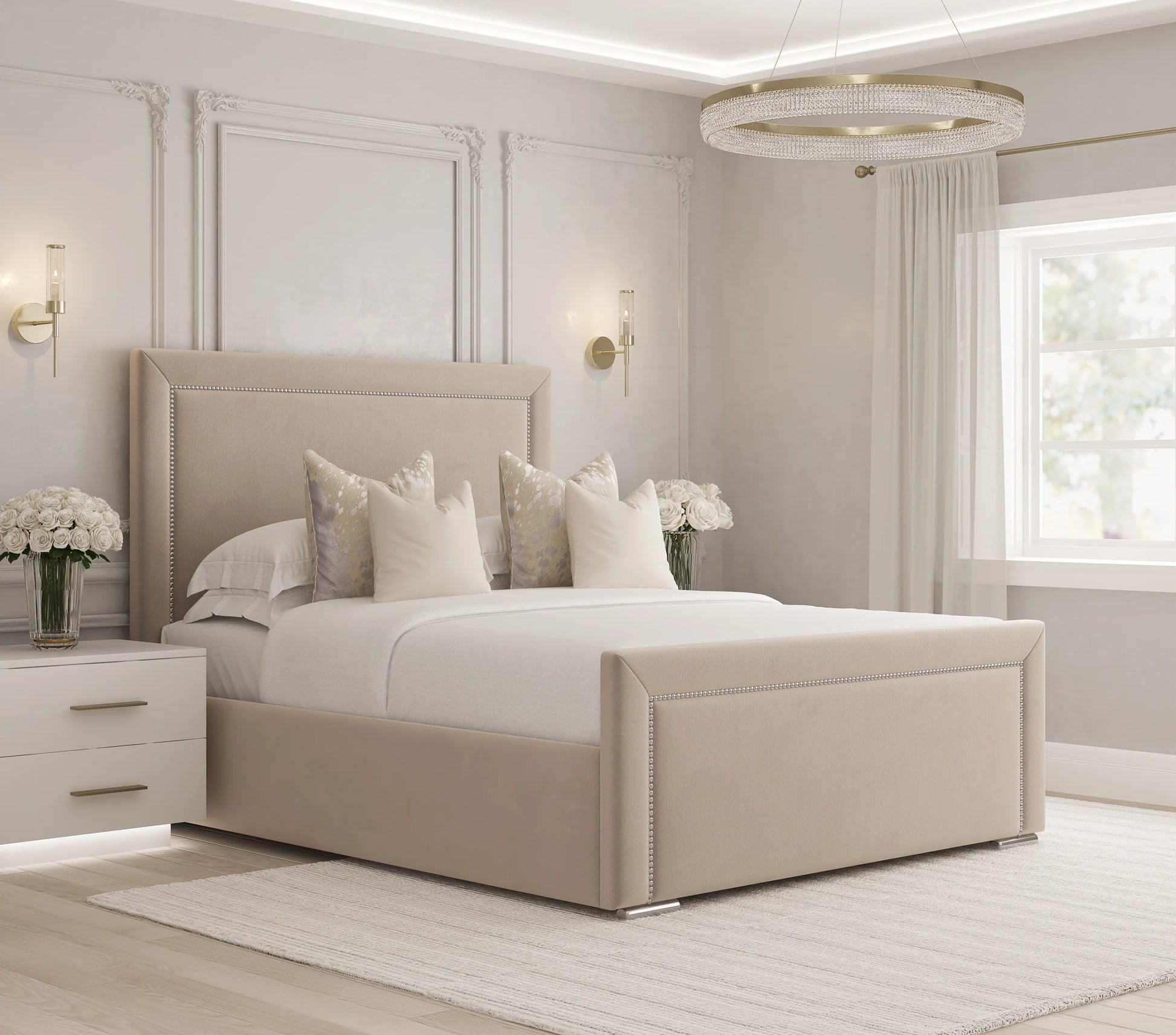 The Hannah Beaded Bed Frame is where timeless elegance meets understated modern design, offering a refined centerpiece that enhances any bedroom setting. Expertly upholstered in soft, high-quality fabric, this bed exudes a calming presence, with its neutral tones creating a soothing backdrop for both contemporary and traditional interiors. Its clean-lined silhouette allows it to blend seamlessly into different décor styles, while carefully placed studded detailing elevates the design with just the right amount of luxury and sophistication.