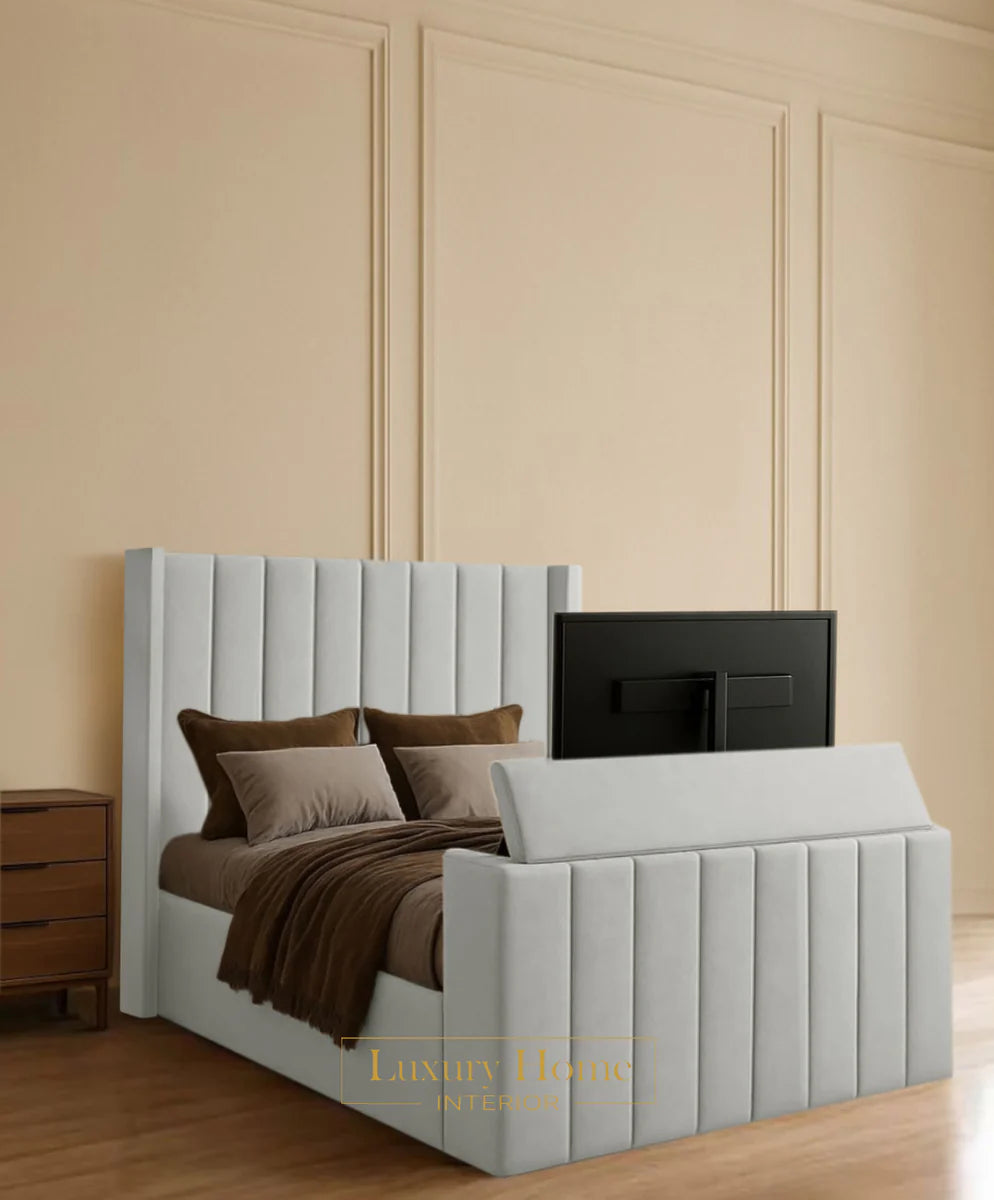 The standout feature of this bed is its cleverly integrated TV lift mechanism, seamlessly concealed within the footboard. At the simple press of a button, your screen glides smoothly into view, giving you an instant home-theatre experience from the comfort of your sheets. When not in use, the television tucks neatly away, maintaining the bed’s sleek, uncluttered design. This smart functionality makes it especially appealing to technology enthusiasts who appreciate convenience without compromising on style.